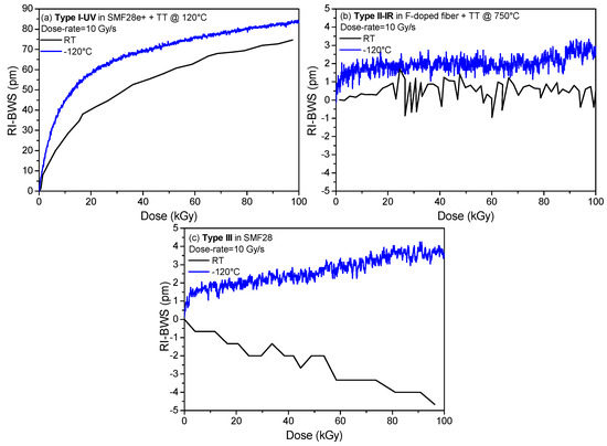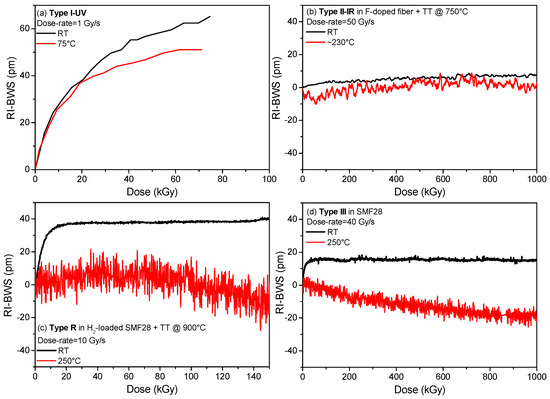 Moreover, in addition to the higher BWS values, the different types of FBGs present different kinetics for the RI-BWS. The type I UV grating is characterized by a RI-BWS increasing with the dose, without reaching a saturating level at 1 MGy TID. Both types II and III FBGs, instead, present a strong increase in the Bragg peak shift up to ~20 pm at about 50 kGy and then stabilize. Additionally, the type R grating shows a fast and strong RI-BWS increase at the irradiation start (40 pm for a TID of 50 kGy), but, contrary to types II and III, at higher TID the shift seems to increase linearly with the dose. In conclusion, at RT, type II and type III show the highest radiation tolerance, compared to type I or type R.