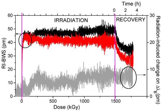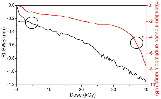 The first one is the “radiation-induced Bragg wavelength shift”, hereafter indicated as RI-BWS. As shown in Equation (1), the Bragg wavelength depends on the effective refractive index at and the grating period. The refractive index change is caused by the RIA and the RIC and is known as the “radiation-induced refractive index change” (RIRIC). The grating period modification, instead, can be reduced as a consequence of the compaction. As already mentioned, the latter effect is negligible in most cases; then, RI-BWS can be mainly associated with RIRIC.