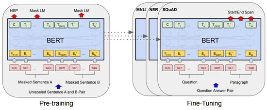 The architecture of a BERT network can be seen in Figure 2, where the pre-trained version is shown on the left side, and fine-tuned versions adjusted for different tasks are shown on the right. The model is trained using unlabeled data from different tasks in the pre-training stage. In principle, it is possible to use pre-trained BERT models to produce contextual embeddings that can be used for (un)supervised learning tasks. The model is initialized with the pre-trained parameters in the second stage, from fine-tuning to given supervised learning tasks. Then, these parameters are readjusted using data labeled for the task to be solved. Since fine-tuning is performed by task, each task has an individual adjusted model, even if they were initialized with the same pre-trained parameters [].