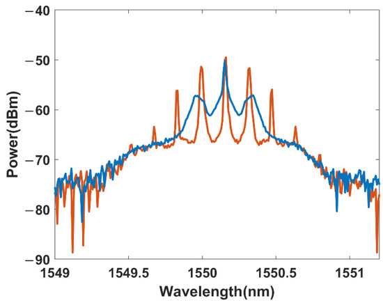 As shown in reference [19], when a narrow-bandwidth light is phase-modulated by the PM, symmetric discrete sidebands are generated around the central-frequency light. As the modulation frequency is near the maximum MI gain frequency, induced MI can be excited significantly. The coherent seeds amplified by the induced MI can be observed from the red line of Figure 1. Compared with the spontaneous MI initiating from the ASE, the induced MI originating from the coherent seed is more competitive. Therefore, the induced MI excited by the coherent seed has more gain, while the spontaneous MI is suppressed effectively. Then, the continuous spectrum (relatively continuous within the gain bandwidth of MI) of the spontaneous MI is replaced by a discrete spectrum composed of the amplified coherent seeds. Finally, the amplified coherent seed can be filtered by Filter 2, which possesses a minimum filtering bandwidth of 10 GHz. In this way, the spontaneous MI as well as the induced phase noise increase can be suppressed.
