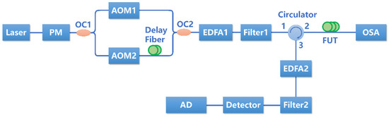 The MI-induced phase noise in long-haul Φ-OTDR is studied with the experimental setup shown in Figure 2. A narrow-linewidth laser with a wavelength of 1550.1 nm is used as the light source. The light is modulated by an electronic-optic phase modulator (PM) to generate sidebands around the central frequency. The phase-modulated light is then divided equally by a 50:50 coupler (OC1) and injected into two acoustic-optic modulators (AOM) with frequency shifts of 200 MHz and 220 MHz, respectively. The typical pulse width is set as 200 ns. A 60 m delay fiber is inserted in one path to generate a time delay between two pulses. After combining with another 50:50 coupler (OC2), dual pulses with a time delay of 300 ns and a frequency difference of 20 MHz are generated. It is noted that the dual pulses have the same optical power. Then, the dual-pulses are amplified by an erbium-doped fiber amplifier (EDFA 1) and filtered by a narrow-band filter (Filter 1). After that, the dual pulses are injected into the 25 km fiber under test (FUT) through a circulator. The key parameters of the 25 km FUT are as follows: the nonlinear index is , the linear loss is , and the dispersion index is . The optical spectra at the end of the FUT can be recorded by an optical spectra analyzer (OSA). The Rayleigh scattering light is amplified by the other EDFA (EDFA 2) and filtered by a comb filter (Filter 2) to suppress ASE noise. Finally, the filtered light is detected by a photodetector with a bandwidth of 300 MHz and sampled by a high-speed acquisition card. The input power to the FUT can be controlled by changing the gain of EDFA 1. Filter 1 is a narrow-bandwidth filter with a bandwidth of 1 nm. Filter 2 is a multi-channel programmable filter with a minimum bandwidth of 10 GHz.