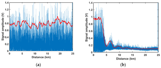 The normalized Rayleigh trace (blue line) and its normalized amplitude (red line) along the FUT when the input power is: (a) 150 mW; (b) 1240 mW.