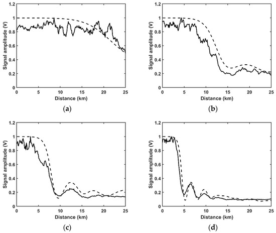 To fully show the effect of MI on the normalized amplitude, the evolutions of the normalized amplitudes along the optical fiber in different input powers situations are shown in Figure 4. The experimental results are shown in solid lines. When the input power is lower than the MI threshold (150 mW), the normalized amplitude keeps nearly constant along the whole 25 km FUT (Figure 3a). When the input power is higher than the MI threshold (374 mW), MI starts to occur and the optical power at the central frequency converts to the spontaneous MI sidebands, which leads to a decrease in the normalized amplitude at the far end of the fiber (Figure 4a). When the input power is 500 mW, the normalized amplitude decreases quickly along the 25 km FUT, and a slight recurrence can be found at the far end of the fiber (Figure 4b). With the further increase in the input power, the recurrent evolution of the normalized amplitude becomes more drastic, and multiple-recurrent evolution can be observed in the FUT. When the input power is 745 mW, two recurrent periods can be found (0~12.6 km and 12.6~18.86 km). When the input power is 1240 mW, at least three recurrent periods can be found (0~6.5 km, 6.5~9.5 km and 9.5~12.9 km). It should be noted that the visibility of three recurrent periods without any distributed amplification reveals the low noise of the experimental system [22].