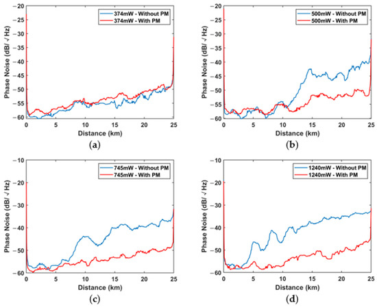 The evolution of phase noise along the FUT in experiment without phase modulation (blue lines) and with phase modulation (red lines): (a) 374 mW; (b) 500 mW; (c) 745 mW; (d) 1240 mW.