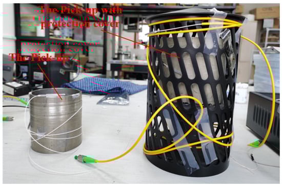 As shown in Figure 5, the optical fiber ring is tightly wound on the upper part of the titanium alloy pick-up, and the experiment settings based on the Sagnac photoacoustic sensing system are shown in Figure 6.