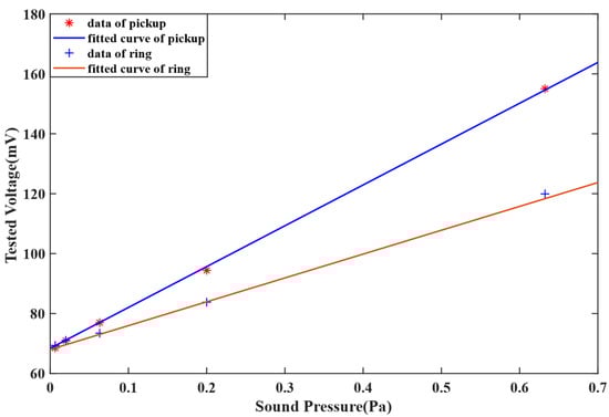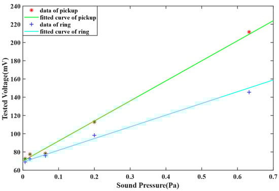 Figure 7 shows that, when the optical fiber ring was replaced by pick-up, the sensitivity of the sensing system obviously improved. The fitted curve of the pick-up data is VPout = 219.8*s + 70, and the sensitivity recaches 219.8 mV/Pa, while the fitted curve of the optical fiber ring is VRout = 128.4*s + 69, and the sensitivity is 128.4 mV/Pa. It means, when the pick-up was used, the sensitivity increased by 71.2%.