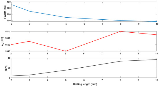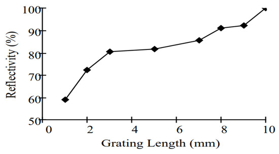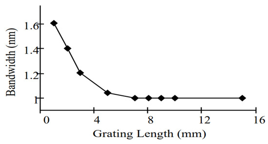 Similarly, another study tried to determine the least bandwidth and the highest reflectivity by changing the grating length and remarking on the bandwidth and reflectivity [16]. The study showed a negative correlation between the bandwidth and the grating length, as shown in Figure 11. Moreover, it shows a positive correlation between the grating length and the reflectivity, as depicted in Figure 12. However, the proposed method showed a complete optimization in that c in the contradicting test case. In addition, the current method shows higher reflectivity and narrower bandwidth.