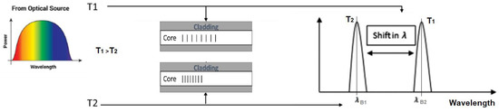 Figure 2 depicts a conceptual scenario showing how the FBG temperature sensor works. When an optical source indicated on the left of the figure is applied to the FBG sensor with a structure and grating shown in the middle of the figure that changes by increasing the applied temperature based on the coupled mode theory, which says the wavelength of Bragg depends on the effective refractive index and the grating period and represented mathematically in Equations (1)–(4) [22]. Therefore, for every change that occurred to the measured physical signal, there was an equivalent change that happened to the refractive index of the core of FBG, which, in turn, caused a shift in the base wavelength of the reflected wave. Figure 2 shows on the right the change in the base wavelength from to due to changing the temperature from to .