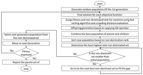 Based on the mathematical equations presented in the previous section, the reflected power of FBG and the bandwidth as objective functions can be modeled as a function of the grating length, grating period, and the change of refractive index. Moreover, from there, NSGA-II has been chosen for determining the Pareto front and calculating the optimum value of the control variable, which are grating length, grating period, and refractive index, for reaching the optimum values of the objective functions, which are the bandwidth and reflectivity with minimized sidelobe. Figure 3 charts the logic flow of NSGA-II. It starts with setting the initial parameters such as population size, number of generations, and initial populations of the grating parameters. Then it calculates each individual’s fitness in the initial population by calculating the bandwidth and reflectivity based on Equations (2)–(4). Then it assigns fitness and nondominated rank for each individual. Next, it sorts based on the level of nondomination calculation and the crowding distance evaluation. The next step is to apply GA operators such as mutation and crossover operators. Then it combines the population of the selected individual from the last generation based on the nondominated ranking and fitness along with the individuals yielded by the GA operators, i.e., crossover and mutation. After it selects the best nondominated individuals, it compares them with the initial population to check feasibility. If they are feasible solutions, they are chosen to be with the next generation; otherwise, it keeps calculating nondominated answers and ranking. Then it checks the termination condition, such as reaching the maximum number of iterations, to decide either to terminate or go back to repeating the process. Furthermore, RNSGA-II is a modified NSGA-II that enables setting reference values of the objectives for determining solutions that give the nearest to these references. The RNSGA-II has been utilized as an advanced method to help decision makers get the closest solutions to their preferences. Following this logic, the NSGA-II and RNSGA-II gain many advantages compared to GA and all other evolution algorithms. For example, because it is based on sorting the ranked nondominated solution, it becomes closer to the Pareto front solutions. By using the crowding distance technique, the algorithm has significant diversity in choosing the populations. Finally, it utilizes the elitist method to make sure of transferring the best solutions from one generation to the next. To prove the superiority of the selected method, NSGA-II, the optimization problem has been solved at the same conditions, and values of all parameters using G comparison have been conducted to validate the performance parameters.