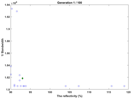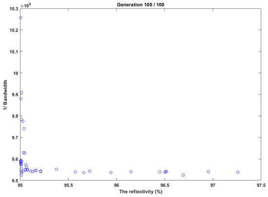 In this test case, NSGA has been tested, as shown in Figure 4. It determined the grating parameters that realize a high reflectivity of 95% and narrow bandwidth of less than 1 nm. Figure 4 shows the results of NSGA-II for optimizing the bandwidth and reflectivity to increase reflectivity and minimize bandwidth. The results demonstrated in Figure 4 clearly show that the Pareto front is determined successfully, the reflectivity was reported as 96.902%, and the bandwidth was 0.830319 nm.