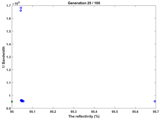 Similarly, the contradictory condition is tested with the RNSGA-II, as shown in Figure 7 depicts the results of increasing the bandwidth and the reflectivity. It shows that the Pareto front is obtained successfully, and the nearest values to the reference point set have been determined. The results were 4.95385 and 90.067% for the bandwidth and reflectivity, respectively.