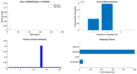 The GA has been selected as one of the most common optimization methods to be compared with the proposed methods. Figure 8 shows the results of the GA optimization test, including the fitness and convergence, cost function, and solution. Results were 40.169% and 2.93851 for reflectivity and bandwidth in the case of targeting reducing the bandwidth and increasing the reflectivity. Moreover, in the second scenario for increasing the reflectivity and bandwidth, the results were 5.53859 nm for the bandwidth and 55.151% for the reflectivity.