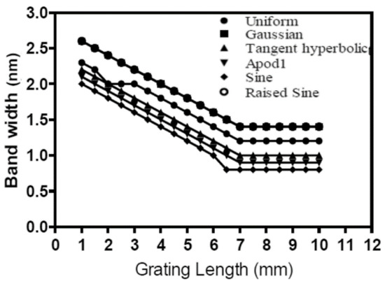 For deriving a relation between bandwidth, reflectivity, sidelobe and grating length, and the change in refractive index. The bandwidth can be determined by Equation (2), which shows the bandwidth depends on the grating parameters, such as the variation in the refractive index [22].