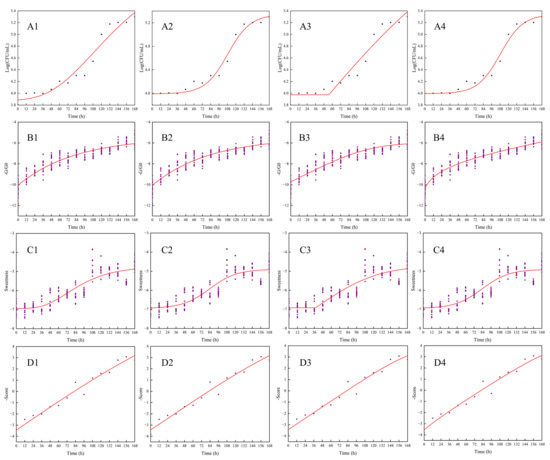 The data obtained from plate counting was used for fitting the growth curve of the Modified Gompertz, Logistic, Huang and Baranyi models. As shown in Figure 1(A1–A4), the logarithm of total bacterial count (LogCFU/mL) increased nonlinearly with storage time. Growth of total bacterial count in freshly squeezed strawberry juice was slow at 4 °C with a long period of lag phase. Low temperature and the ratio of sugar to acid could, to some extent, inhibit the activity of bacterial growth in juice [41].