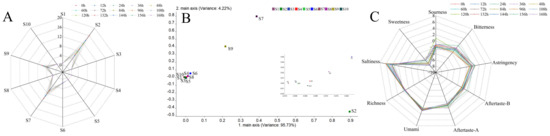 With the extension of storage time, the response values became lower, indicating that the intensity of VOCs decreased. Loadings analysis, characterizing the contribution rate of sensors to the overall flavor characteristics, is shown in Figure 2B with the variance of PC1 reaching 95.73% and the variance of PC2 reaching 4.22%. S2, S7 and S9 contributed greatly to the first and second principal components, which are in accordance with Liu et al. [42]. Results showed that the aroma characteristics of freshly squeezed strawberry juice consisted of nitrogen oxides, inorganic sulfides and aromatic components (Table 2).