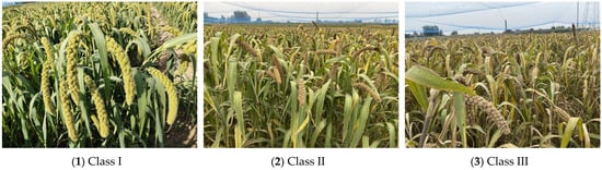 The original image of the foxtail millet ear was collected at the experimental base in Shen Feng Village, Shanxi Agricultural University. The shape of the ear of the foxtail millet is cylindrical or nearly spinning, and it is mainly in a pendulous state, as shown in Figure 1. In order to obtain more characteristics of the foxtail millet ears, this study was carried out mainly from the top side. A total of 300 original images were collected, and stored in JPG format, including 25 images of the heading stage (Class I), 230 images of the filling stage (Class II), and 45 images of the maturing stage (Class III).