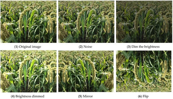 Considering the hardware and GPU performance of the laboratory computer, compressing the image pixels to 1024 pixels × 768 pixels and it will help speed up the model training. LabelImg software was used to manually annotate the datasets according to the PASCAL VOC dataset format and the annotation files were saved in XML format. Small datasets may lead to model-fitting phenomena; therefore, data augmentation is used in this study to expand the datasets. The main methods are flipping, mirroring, luminance changes, and adding noise to simulate the conditions that may occur during the capture of images during detection and to improve the generalization ability of the model. The data augmentation results are shown in Figure 2. The original foxtail millet ears dataset was data augmented to obtain a total of 2100 images, which were randomly divided into a training set, a validation set, and a test set according to the ratio of 8:1:1.