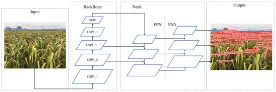 In northern China, foxtail millet is a characteristic miscellaneous grain crop with qualities such as drought and water conservation, a high nutritional value, and environmental friendliness []. The demand for cereal production is rising globally due to the need for nutrient-focused agricultural development, green and sustainable ecosystem development, and quality development []. The head of foxtail millet is an important indicator to assess the yield and quality of the grain. The detection and research of foxtail millet ear can not only help breeders to accurately evaluate germplasm resources, but also provides agriculturalists with ways to manage production costs at a reduced level. Therefore, it is of great significance to study a foxtail millet ear detection method with a low arithmetic power requirement which can be applied to mobile devices for crop breeding, cultivation, yield improvement, and agricultural production.