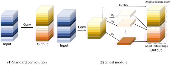 GhostNet is a lightweight feature extraction network proposed by Huawei’s Noah’s Ark Lab in 2020 []. It adopts an end-to-end neural network architecture and outperforms MoblieNetv3. The core of GhostNet is the Ghost module. Figure 4 shows the convolution process between the standard convolution and the Ghost module. The Ghost module introduces linear operations instead of partial convolution. Compared with standard convolution, it is divided into two steps: in the first step, standard convolution is used to generate a small number of intrinsic feature maps; in the second step, more Ghost feature maps are obtained with a small number of parameters based on the feature maps generated in the first step using linear operations, such as depth convolution or shift operations. Finally, the feature maps generated by the two steps are merged to obtain the output feature map of the Ghost module. Under the condition that the input and output feature maps have the same size, the calculation amount of the Ghost module is much lower than that of ordinary convolution, which realizes the acquisition of more feature information with less calculation, and does not negatively affect the performance of the model.