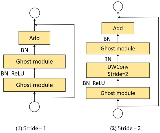 Based on the lightweight advantage of Ghost modules, Ghost-BottleNeck is constructed by stacking two Ghost modules, as shown in Figure 5. When the step size is 1 (Figure 5(1)), the first Ghost module is the expansion layer, expanding the number of channels and increasing the dimensionality of the features; the second Ghost module is used to reduce the number of channels and reduce the dimension of features, and make them match shortcut path. Shortcut connects the input and output of the two Ghost modules. Referring to the structure of MobileNetV2, the ReLU activation function is not used after the second Ghost module, and batch normalization (BN) and ReLU activation functions are introduced after each other layer. When the step size is 2 (Figure 5(2)), the shortcut path consists of a downsampling layer and depthwise convolution with stride = 2, where the depthwise separable convolution can reduce the number of channels.