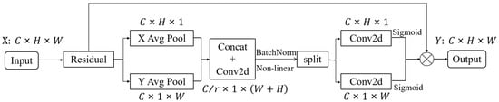 The CA mechanism is a computing unit that can enhance the feature expression ability of the network. It can take any intermediate feature tensor as input and get an output feature tensor of the same size as the input, C represents the number of channels, H and W denote the height and width of the input feature map, respectively. The CA module consists of two steps: coordinate information embedding and coordinate attention generation, which encodes channel relationships and long-range dependencies through precise location information, and the structure of the CA attention mechanism is shown in Figure 6.