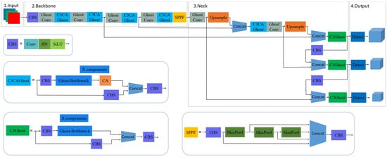 The structure diagram of the improved YOLOv5 model is shown in Figure 7, which can be used for real-time detection of foxtail millet ears in the field. The lightweight GhostNet algorithm is used to improve the Yolo V5s model by reducing the size of the model and the number of parameters, effectively saving computational resources. Considering the factors such as dense growth of foxtail millet ears, inconsistent scale, and serious shading in complex field environments, it is easy to cause the loss of target information, which is not conducive to the detection of foxtail millet ears in the field. This study introduces the CA attention mechanism, which adds position information to the channel attention and helps the lightweight model to obtain more feature information. The CA attention mechanism is incorporated into Backbone’s Ghost-BottleNeck structure to reconstitute the backbone feature extraction network of the lightweight model, giving it a strong feature extraction capability without adding redundant network computations.