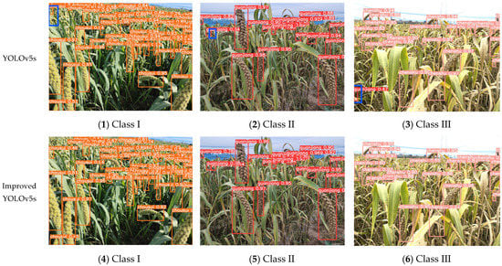 Detection of foxtail millet ears at different periods by the improved YOLOv5s model and the original YOLOv5s model.