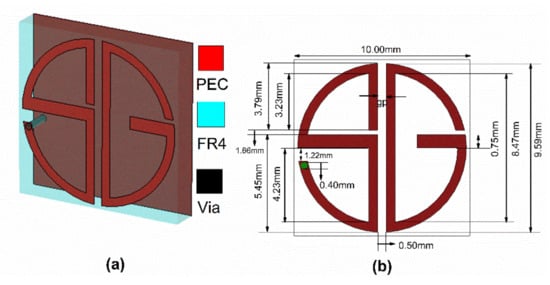 A schematic diagram of the reflective type cross-polarization converting metasurface with the simulated setup is shown in Figure 1a. A single-layer FR4 lossy is used as a substrate with dielectric constant (εr) = 4.4 and loss tangent (tan δ) = 0.002. S-and G-shaped metal patches separated with a parasitic gap and grounded via to the S-shape that makes the structure resonate at 5.2, 6.9, and 8.05 GHz. The unit cell dimensions are 10 mm3 × 10 mm3 × 1.6 mm3. The geometric dimensions of the unit cell are shown in Figure 1b. The numerical simulation software CST MWS is used for design and simulated analysis.