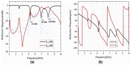 The investigation of the cross-polarization conversion behavior of the proposed structure is carried out under linear polarized incidence. Figure 2a,b depicts the simulated reflection characteristics of the design. The structure provides three co-polarized (S11) resonating bands at 5.2, 6.9, and 8.05 GHz.