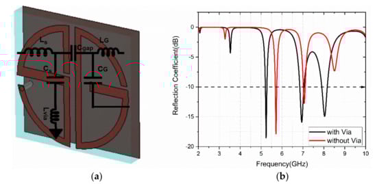 (a) Unit cell equivalent LC-circuit model representation; (b) Comparison of S11 with and without via.