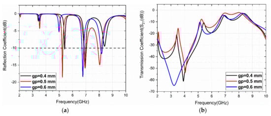 Parametric analysis of gap (gp) between S-and G-patches: (a) S11 (dB), (b) S21 (dB).