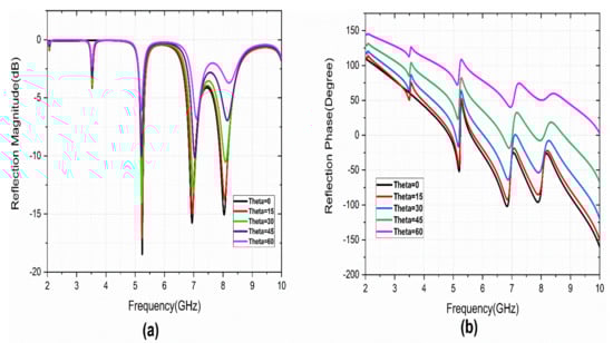 Reflection characteristics under TM incident angle variation: (a) magnitude (b) phase.