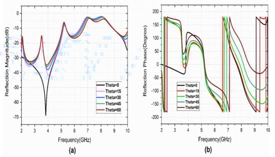 Reflection characteristics under TE incident angle variation: (a) magnitude, (b) phase.