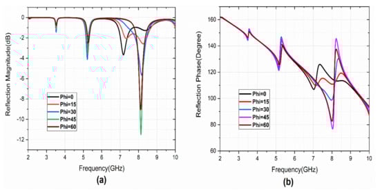 Reflection characteristics under Phi variation: (a) magnitude, (b) phase.