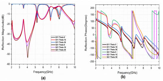The reflection characteristics of the PCRM with vertically polarized (TE) and horizontally polarized (TM) wave incident angle (theta) variation is studied. Figure 8 illustrates the reflection characteristics of the metasurface under TE incidence. It is observed that small variations in reflection magnitude and phase are observed. For these variations, a corresponding variation in S21 is also observed, which also gives the PCRM the ability to work as a polarization converter under TE incident angle variation.