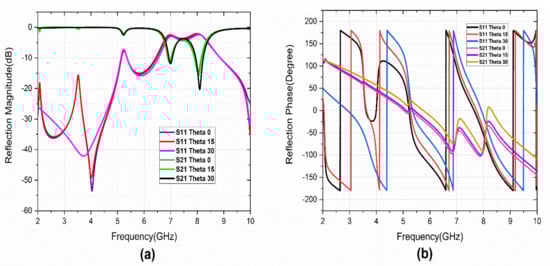 S11 variation with Theta variation: (a) magnitude, (b) phase.