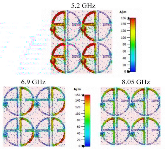 Simulated Surface current distribution at 5.2, 6.9, and 8.05 GHz.