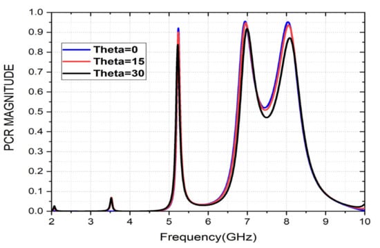 ryx represents a cross-polarized component, i.e., S21, and rxx represents the co-polarization component, i.e., S11. The highest polarization conversions obtained are 92% for the first operating band, 94% for the second operating band, and 93% for the third operating band under normal incidence. The PCR variation with oblique angles of the incident wave (theta) is also calculated and presented in Figure 11. Incident angles of up to 30° provides a PCR value of more than 85%.
