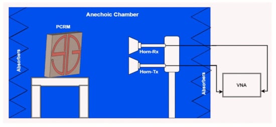To validate the design, a 3 × 3 experimental sample was fabricated and measured, and the co-and cross-polarization reflection characteristics were calculated, as well as the PCR value. The fabricated sample is given in Figure 12. The schematic diagram of the experimental setup for characterization is shown in Figure 13. Anritsu MS2037C VNA and two standard horn antennas were used as transmitters and receivers with x-and y-polarization. The measured and calculated results agreed well. The observed variations in measured results were due to fabrication and measurement errors only. Figure 14 shows the comparison between simulated and measured results of the reflection magnitude and PCR under the normal incidence of the incoming wave. The variation in measured results was due to fabrication errors and size limitations of the prototype in the measurement setup. The measured results were taken at normal incidence angles.
