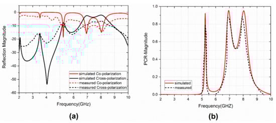 Comparison between simulated and measured results: (a) reflection magnitude, (b) PCR.