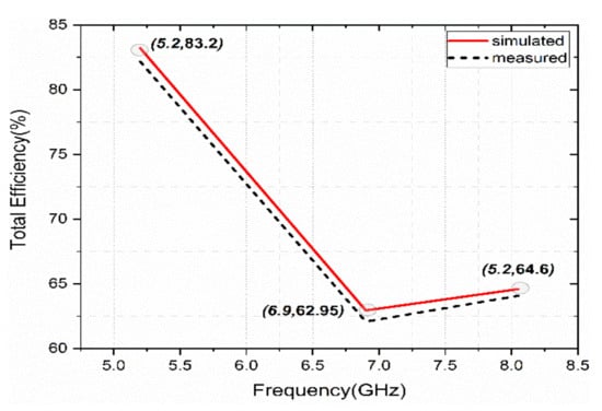 The simulated and measured total efficiency is shown in Figure 15. The measured data shows similar efficiency curves as the numerically computed total efficiency. However, the measured efficiency was observed to be a little lower than the simulated values due to substrate losses.