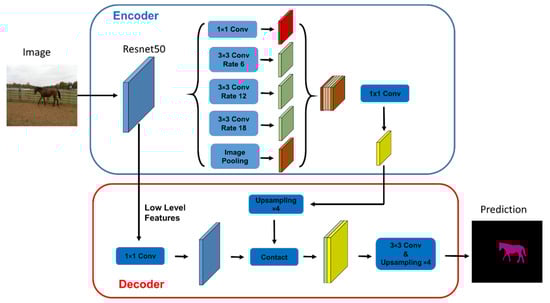 Semantic segmentation is a method for performing classification at the pixel level. All pixels belonging to the same category should be classified into one category. Therefore, semantic segmentation can be used to understand images at the pixel level. Deep learning has achieved great success in the field of semantic segmentation. In 2014, a fully convolutional network (FCN) was developed. FCN replaces the network’s complete connection layer with convolution, thus making it possible to input an image of any size much more rapidly than by using the Patch Classification method [21]. The currently available deep learning semantic segmentation models were developed based on FCN. Deeplab V2, proposed in 2016, uses empty convolution [22] to increase the receptive field without increasing the number of parameters. Using the methods developed in the present paper, it is possible to improve the segmentation network. In 2017, the team improved the pyramid void pooling method in the spatial dimension [23], as shown in Figure 1. Meanwhile, the ResNet model was enhanced by using void convolution/multi-space convolution. To achieve further improvement, two types of neural network were used in DeepLabv3+, a spatial pyramid module and an “encoder–decoder structure”, to perform semantic segmentation [24].