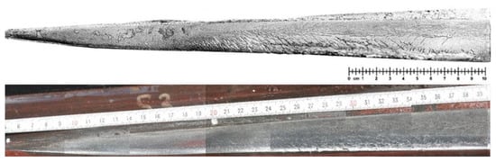 Magnetic particle inspection (above) and camera (below) images of the rolling surface on a frog nose after 33 Mt [26].