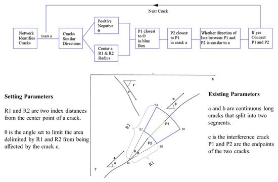 On the one hand, the same crack where there is a gap of a considerable distance will still not be connected. On the other hand, different cracks that are close to one another will be mistakenly connected into the same crack. The shape of a crack is that of a long strip, and possesses the characteristic of extending along a direction. Therefore, an improved region growth algorithm based on direction was proposed. The crack region is used as the seed point, the crack direction and the distance between the crack endpoints in different regions are used as the growth conditions, and better crack connectivity is achieved. A diagram of the growth principle of the crack area is shown in Figure 7. Before using neural network identification and determining the crack location and size of images, each time through the loop, only a certain crack direction is selected. Then, cracks in this picture c are eliminated, the center of the crack radius R1 and R2 is selected, the angle is selected with the crack itself as the positive and negative theta, and the range can be framed within the blue shape in Figure 7. The four points are B1, B2, B3, and B4.