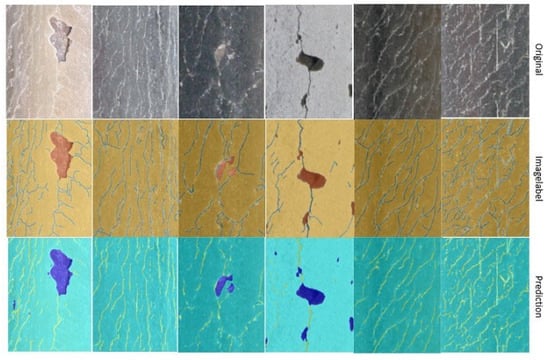 The comparison of the original image, the image label, and the training results (prediction) shown in Figure 9 shows that the results meet the requirements of basic flaw detection. When the crack is relatively straightforward and visible, the training results generated based on the database in this paper are able to accurately identify the crack. In contrast, when the crack is relatively small, or subject to strong light reflection, the training results are relatively poor, resulting in crack discontinuity and other results. Therefore, a reasonable crack growth method is essential to the method proposed in this paper. The cracks, defects, and backgrounds in the five images are accurately distinguished in the results shown in Figure 9. Only the crack in the fourth image produces a discontinuity. Therefore, we use it as an example to demonstrate the crack connection algorithm.