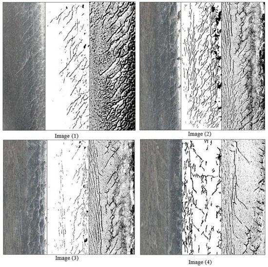 It is assumed that the crack length corresponding to the crack detection in images was detected using MPI. Supposing that the method in this paper is able to detect 50% of the corresponding crack length obtained using MPI when performing crack detection on the image, it can therefore be considered that the crack has been detected. When 80% of the corresponding crack length obtained using MPI is detected when performing crack detection on the image, it can be considered that the crack has been accurately detected. To quantitatively evaluate the crack extraction performance on the basis of the above variables, the resulting detection rate Er is expressed as:
