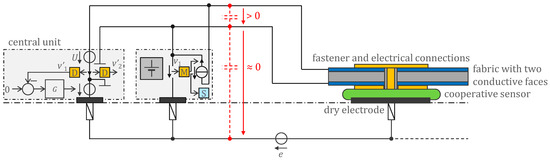 Cooperative sensors are active electrodes equipped with electronic circuits that allow them to be connected to a parallel bus of up to two wires. They are synchronized by the central unit to which they transmit their measured biopotential. For devices that do not need to be defibrillator-proof, the 2-wire bus can be made of a fabric with both sides made conductive. Insulation of the bottom side is not necessary because the voltage between the bottom side and the body is close to zero due to the G controller. The top side can easily be insulated with an additional layer of fabric (e.g., a regular garment), providing that excess of leakage currents is electronically detected. The small cooperative sensors are attached and connected to the fabric, making the assembly seamless while maintaining the usual properties of the fabric, i.e., flexibility, stretchability, breathability, and washability. Symbol legend in Appendix A.