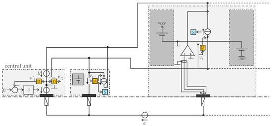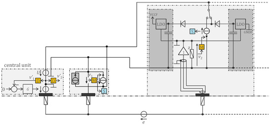 The central unit implementation based on the approach shown in Figure 4 is presented in Figure 12. The two wires A and B of the bus are powered by the voltage source U—a square wave at 1 MHz with a voltage of ±Vh. Every other 1 MHz period, the sensors are not powered by the bus. Instead, one of them—as determined by its address—sends into the transimpedance capacitor, during the period when U = Vh, a quantity of electrical charge proportional to the measured potential. The voltage at the terminals of this capacitor is then sampled by the ADC to be demodulated by the microcontroller. After sampling, the transimpedance capacitor is reset by shorting its terminals with a switch. The controller G in Figure 4 is implemented with a pass-through as in Figure 6.