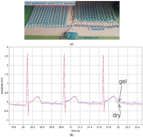 Remotely powered cooperative sensors based on the approach of Figure 3: (a) study prototype made of 224 sensors for ECGi with defibrillation protection between all electrodes; (b) onesubject trial to compare dry stainless steel electrodes with adhesive Ag/Ag+Cl− gel electrodes showing identical noise level for both electrode types (measured from adjacent leads).