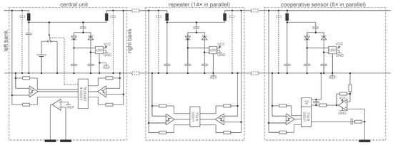 Figure 6 shows a simplified electronic schematic of the entire device (the safety and defibrillator protections are not shown) implementing the principle of Figure 3. The central unit (left) is connected to one of the 14 repeaters (middle) of the right bank, which in turn is connected to one of the eight cooperative sensors (right). The voltage source U of the central unit (see Figure 3) is implemented with switch transistors alternatively connecting the battery (4.6 V) or a bypass (0 V). The repeaters, cooperative sensors, and central unit harvest energy from the two-wire bus using dual half-wave rectifiers. A capacitor connected just before the half-wave rectifiers removes the offset of U (2.3 V) and provides a bipolar VCC/GND supply (±2.3 V) which is symmetrical with respect to REF, the potential of the lower line of the two-wire bus. The LCR triplet consists of an inductor, a parasitic capacitance and two resistors in parallel directly connected to digital outputs of a CPLD (Logic) operating in push-pull mode to send a signal. The edges of the received signal is regenerated by a Schmitt trigger.